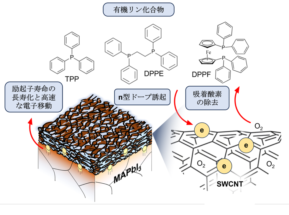 ・有機リン化合物によるn型化注1)の実現 : リン化合物の電子供与により、単層カーボンナノチューブ注2)(SWCNT)を安定的にn型化。フェルミ準位注3)上昇と近赤外吸収変化で電子注入を実証。